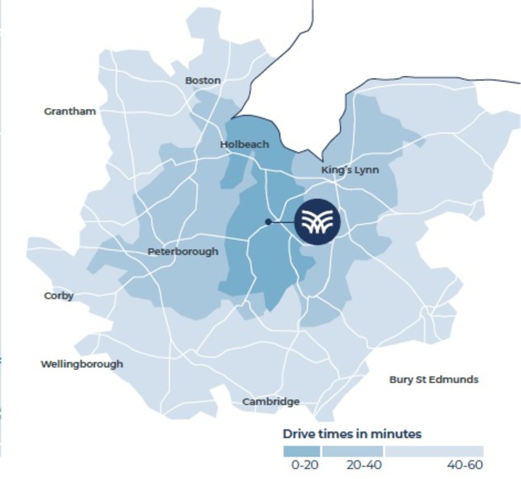 Wisbech is the largest town in Fenland and serves a wide area of villages as well as the town itself. Fenland is home to over 102,000 people, providing a wide potential customer and workforce base.