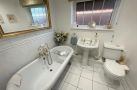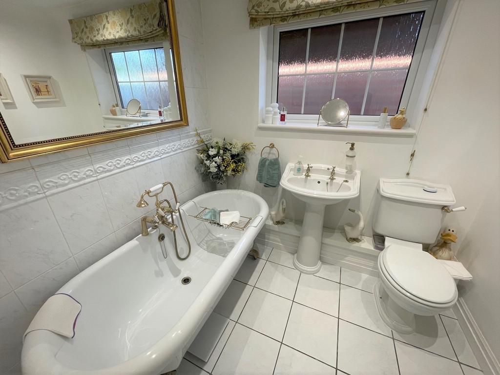 BATHROOM 7' 3" x 6' 2" (2.21m x 1.89m) Inset ceiling lighting. UPVC double glazed window to side. Low-level WC. Pedestal hand basin. Free-standing bath with mixer taps and shower attachment. Part tiled wall. Tiled floor. Radiator.