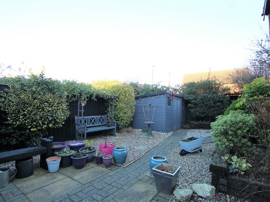 REAR GARDEN Lovely outdoor space made up of patio area over looking lawn with a collection of flowers and shrubs, Timber shed / store. Side gate to the front and rear gate to the village.