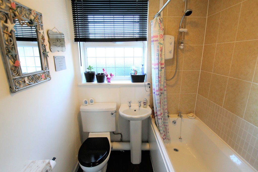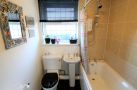 BATHROOM Stylish refitted bathroom offers window to rear. Bath with Electric shower over. Hand wash basin with storage. Low level WC. Fitted shelving. Extractor fan.