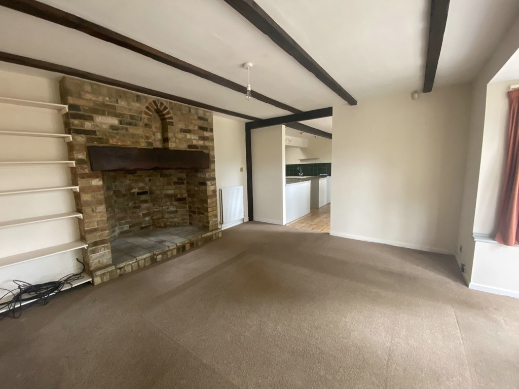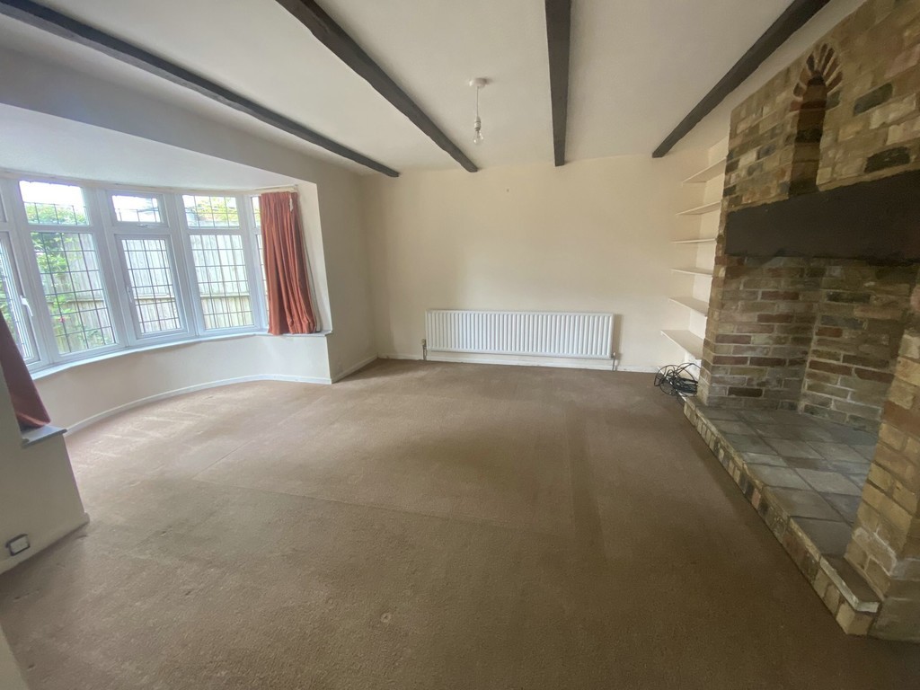 LOUNGE 16' 7" x 13' 11" max (5.05m x 4.24m) Double glazed bay window to front, mock beamed ceiling, recess shelving, feature brick built recess fireplace with wood beam over, two radiators.