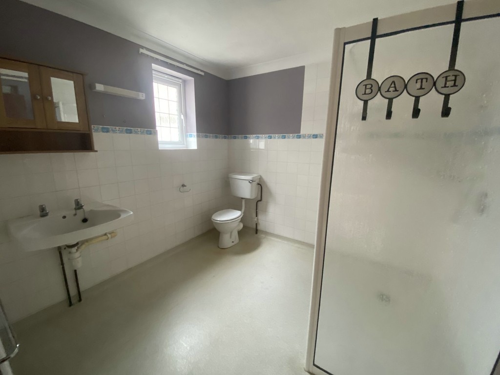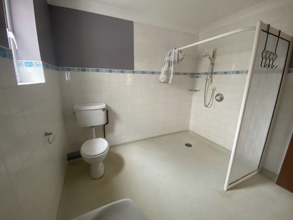 EN SUITE WET ROOM 8' 8" x 8' 6" (2.64m x 2.59m) Having low level wc, wash basin and shower, radiator, part tiled walls, double glazed windows to either side, wall mounted warm air heater.