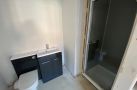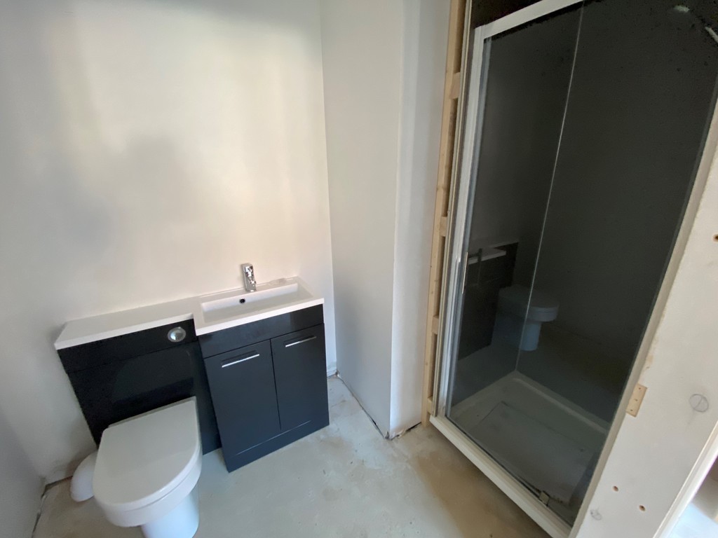ENSUITE Three piece suite comprising shower cubicle, wash basin and low level flush WC. Extractor fan. LVT flooring.