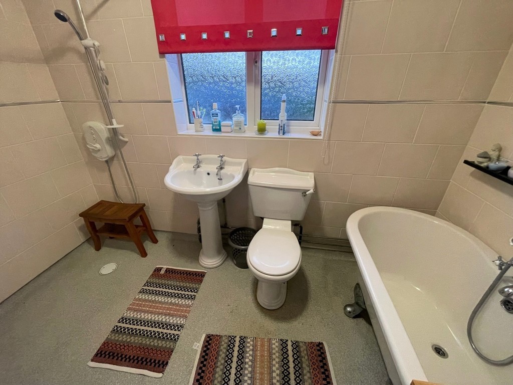 BATHROOM/WET ROOM 10' 2" x 5' 4" (3.10m x 1.65m) UPVC double glazed window to side. Low-level WC. Pedestal hand basin. Free-standing 'slipper' style bath with mixer taps and shower attachment. Wall mounted 'Triton' shower. Fully tiled walls. Radiator. Extractor fan.