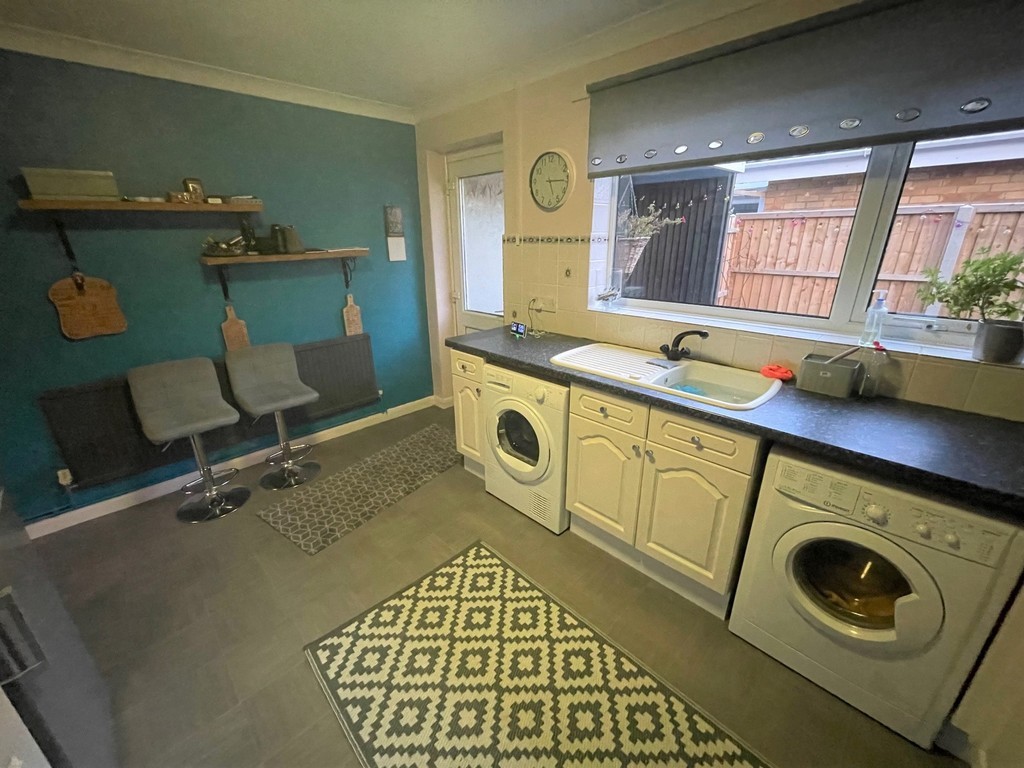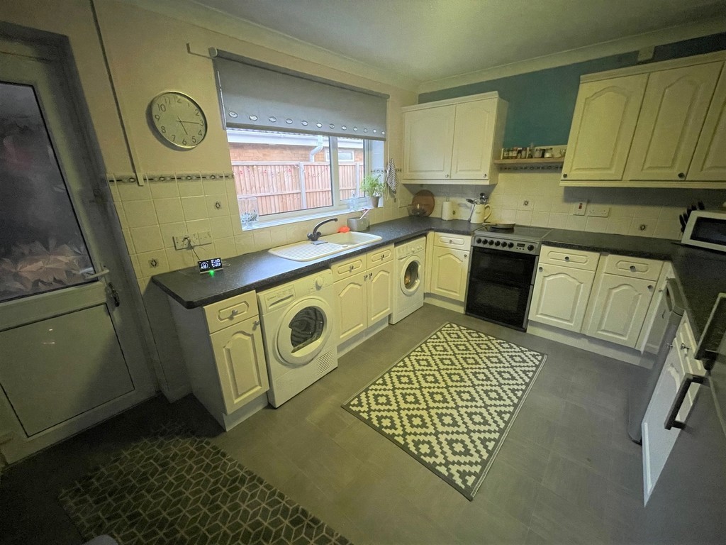 KITCHEN 13' 5" x 9' 10" (4.10m x 3.01m) UPVC part glazed, double glazed door to side. Storm porch over. UPVC double glazed window to side. Range of wall and base units with worktops over. Single sink with drainer and mixer taps. Space for free-standing electric cooker and hob. Plumbing for washing machine and dryer. Space for fridge freezer. Tiled splashback's. Sockets providing USB ports. Radiator.