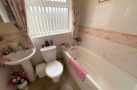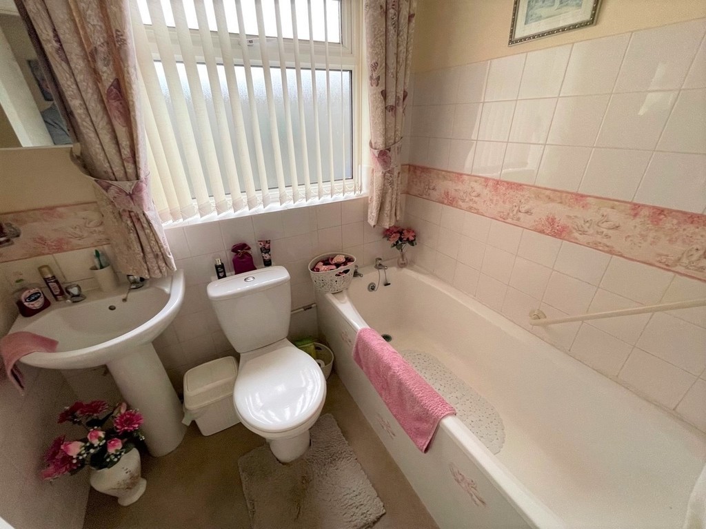 BATHROOM 6' 2" x 5' 6" (1.90m x 1.69m) UPVC double glazed window to side. Low level WC. Pedestal hand basin. Panelled bath with wall mounted 'Triton' shower over. Part tiled walls. Radiator.