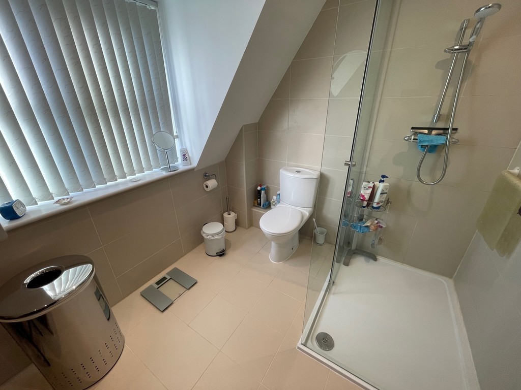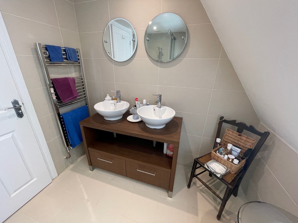 EN-SUITE SHOWER 9' 6" x 7' 3" (2.90m x 2.21m) UPVC double glazed window to front. Inset ceiling lighting. Low-level WC. Shower cubicle. His and hers hand basins/vanity unit with mixer taps. Heated towel rail. Tiled walls. Tiled floor. Extractor fan.