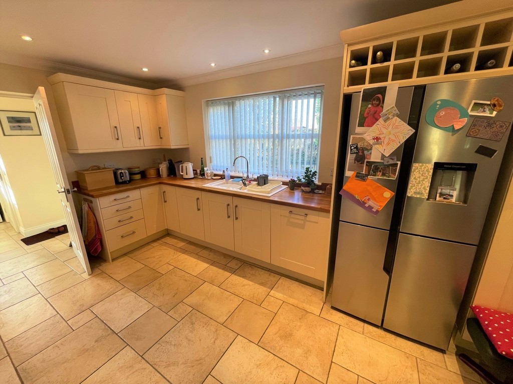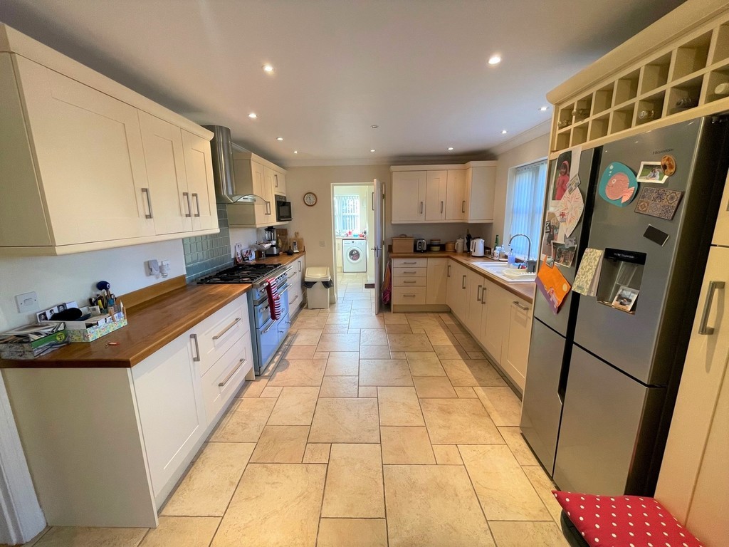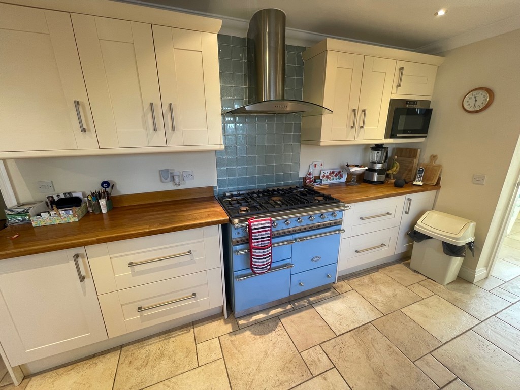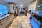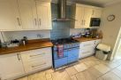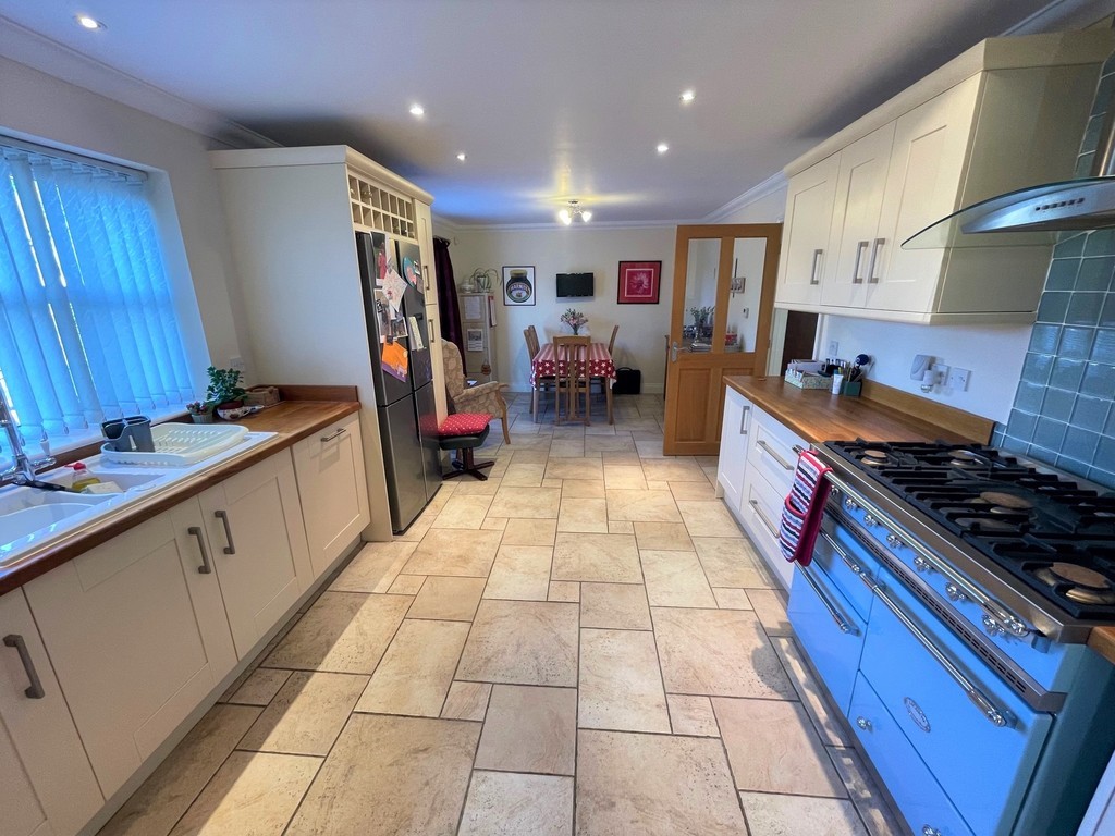 KITCHEN/DINER 23' 11" x 11' 3" (7.29m x 3.44m) UPVC double glazed window and French doors to rear. Inset ceiling lighting. Range of wall and base units with worktops over. One and a half sink with drainer and mixer taps. Integrated dishwasher. Integrated microwave oven. Range style gas oven and hob with extractor fan over. Space for American style fridge freezer. Tiled floor.