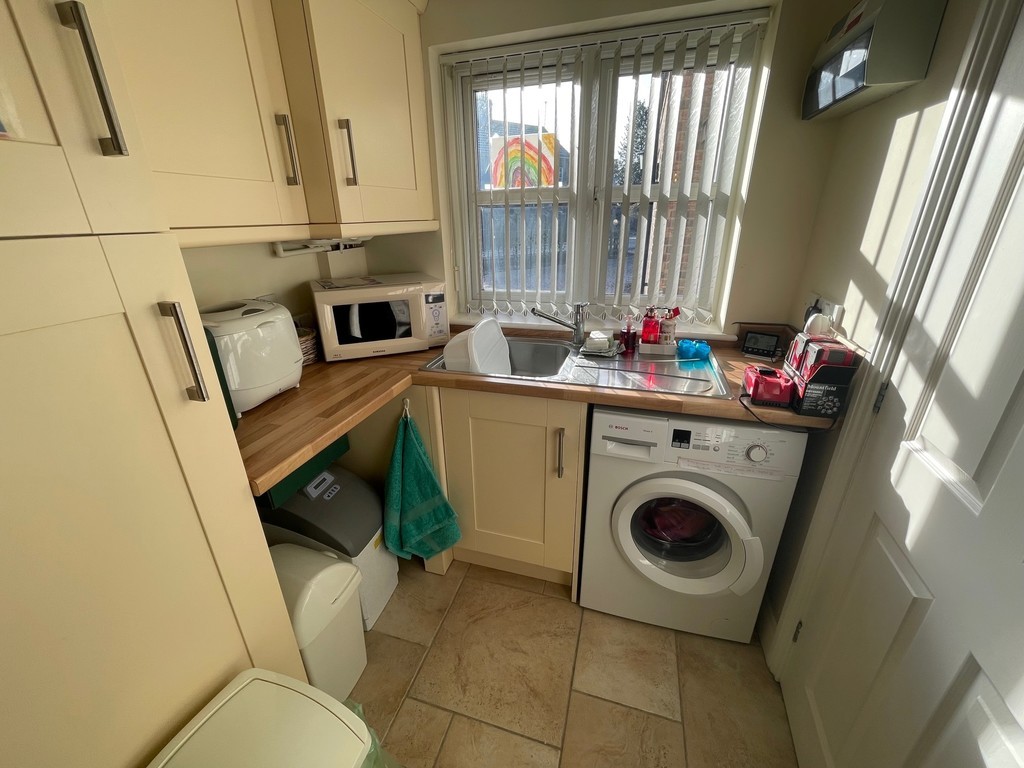 UTILITY ROOM 9' 8" x 9' 7" (2.97m max x 2.93m max) UPVC double glazed window to side and composite door with stainless glass inlay to rear. Inset ceiling lighting. Range of wall and base units with worktops over. Stainless steel sink with mixer taps. Plumbing for washing machine. Tiled floor.