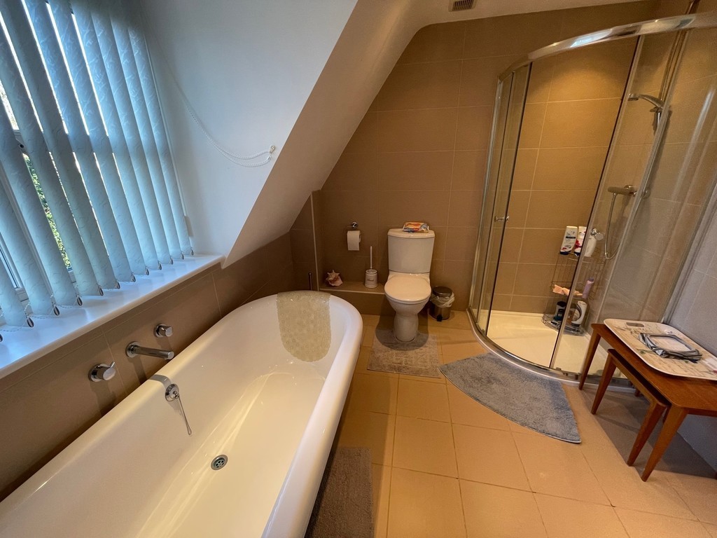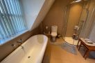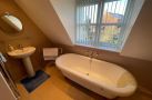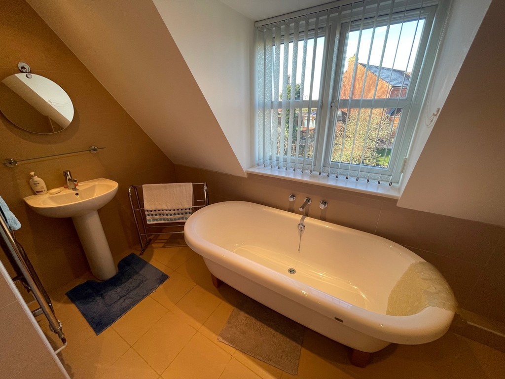BATHROOM 11' 7" x 8' 2" (3.54m x 2.51m) UPVC double glazed window to rear. Inset ceiling lighting. Low-level WC. Pedestal hand basin with mixer tap. Free-standing roll top bath with mixer taps. Shower cubicle. Heated towel rail. Tiled walls. Tiled floor. Extractor fan.