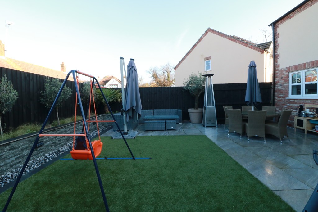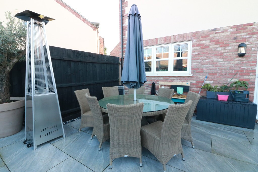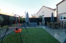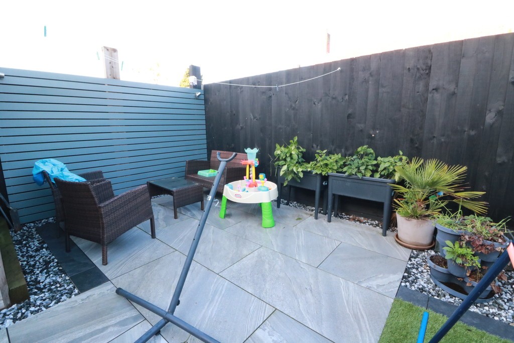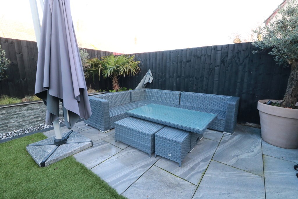 REAR GARDEN Stylish landscaped fully enclosed rear gardens offers all year outdoor entertainment space having an extensive paved porcelain patio / terrace areas. Raised illuminated flower beds. Artificial lawn area. Timber shed. Side gate to parking area.
