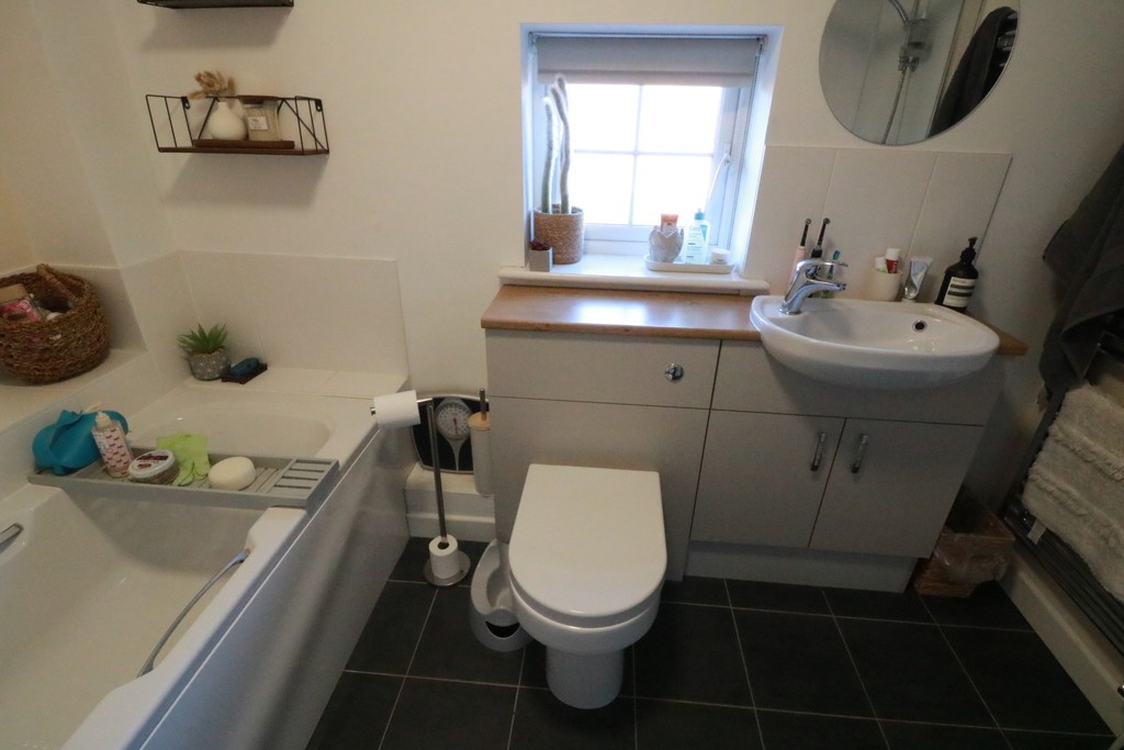 BATHROOM Window to rear. Low level concealed cistern WC., vanity wash hand basin with cupboards under. Bath, corner shower cubicle. Tiled splashbacks and surrounds. Heated towel rail. Tiled floor. Extractor fan.