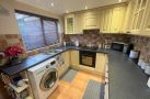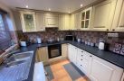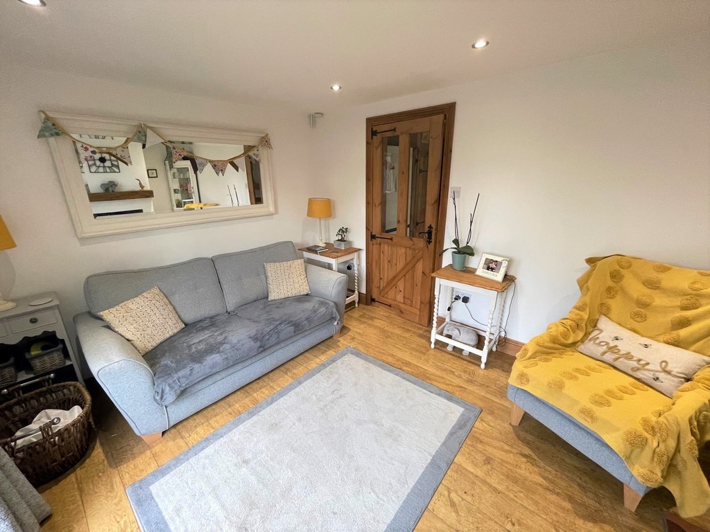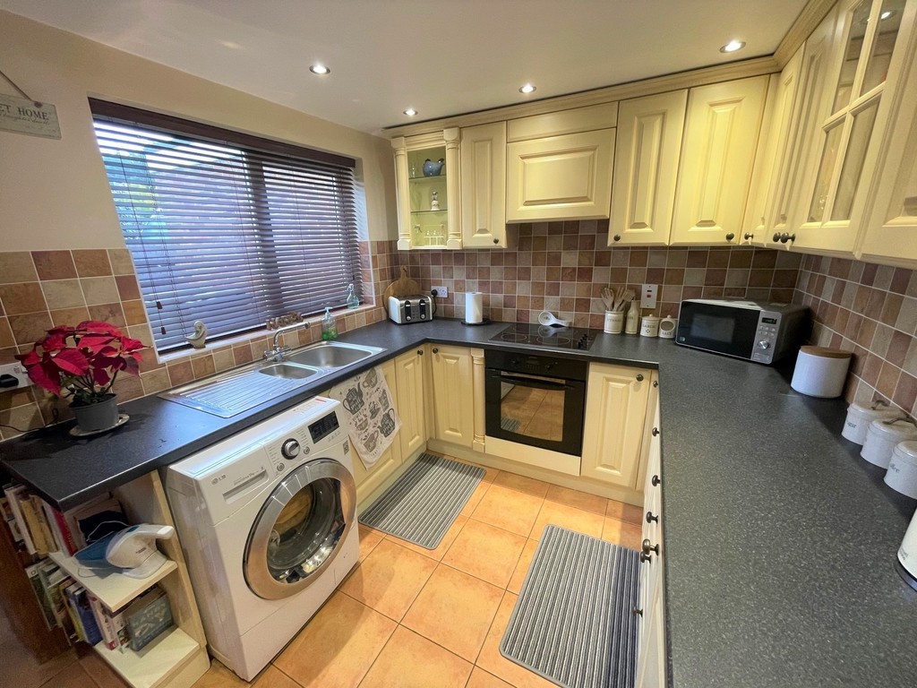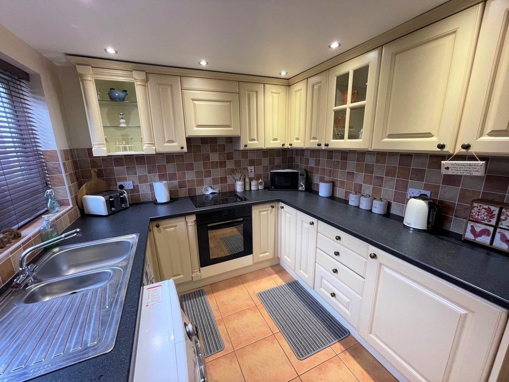 Tiled splash backs. Stainless steel one and half sink with drainer and mixer taps. Built in electric oven and electric hob with extractor fan over. Space for tall standing fridge freezer. Under stairs storage cupboard. Tiled floor. Wooden stable door style leading to stairs to first floor.