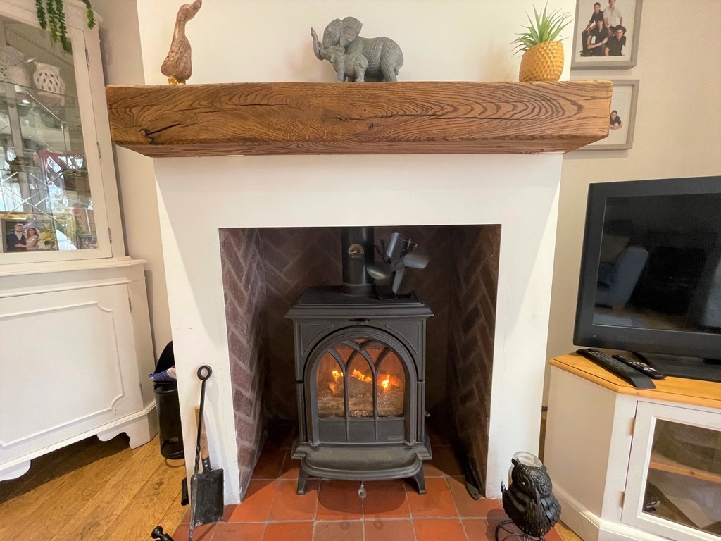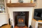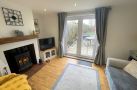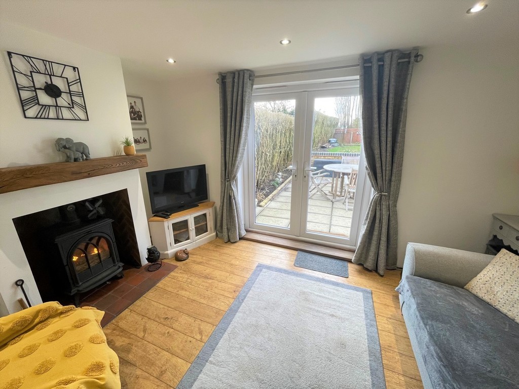 LOUNGE 13' 7" x 9' 10" (4.15m x 3.01m) Inset ceiling lighting. UPVC double glazed French doors to rear. Feature hearth with wood burner, tiled base and wooden mantle. Electric radiator. Wooden floor.