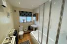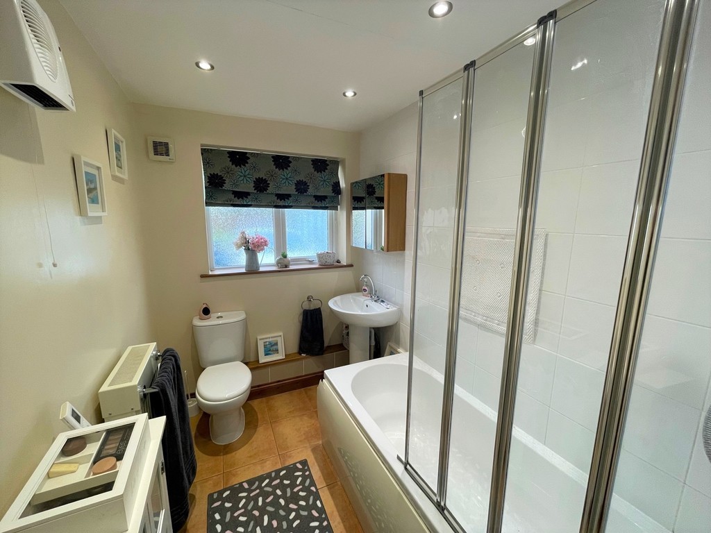 DOWNSTAIRS BATHROOM 10' 11" x 5' 7" (3.33m x 1.72m) Inset ceiling lighting. UPVC double glazed window to rear. Low-level WC. Pedestal hand basin with mixer taps. Panelled bath with mixer taps and wall mounted shower over. Part tiled walls. Wall mounted electric heater. Heated electric towel rail. Tiled floor. Shelved airing cupboard.