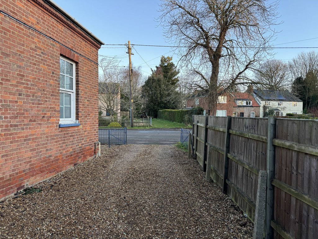 OUTSIDE Gravel surfaced area to front of property enclosed by metal fence. Gravel surfaced driveway to eastern side of the property providing off-road parking. Garden area to rear. The majority of boundaries are enclosed by fencing.