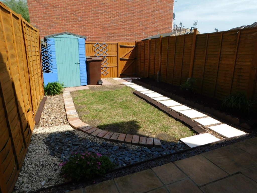 OUTSIDE Front garden is open plan with paved path to front entrance door, rear garden is enclosed with gate to right of way to the rear, borders and lawn, paved patio, garden shed.