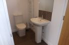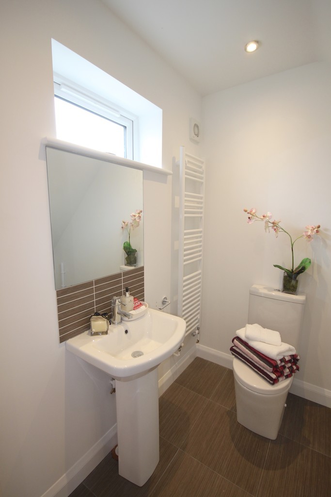 EN SUITE SHOWER ROOM 8' 1" x 5' 8" (2.46m x 1.73m) Space and plumbing for automatic washing machine, walk in tiled shower cubicle, pedestal wash basin with tiled splashback, low level wc, upright towel radiator, double glazed window, inset spot lighting.