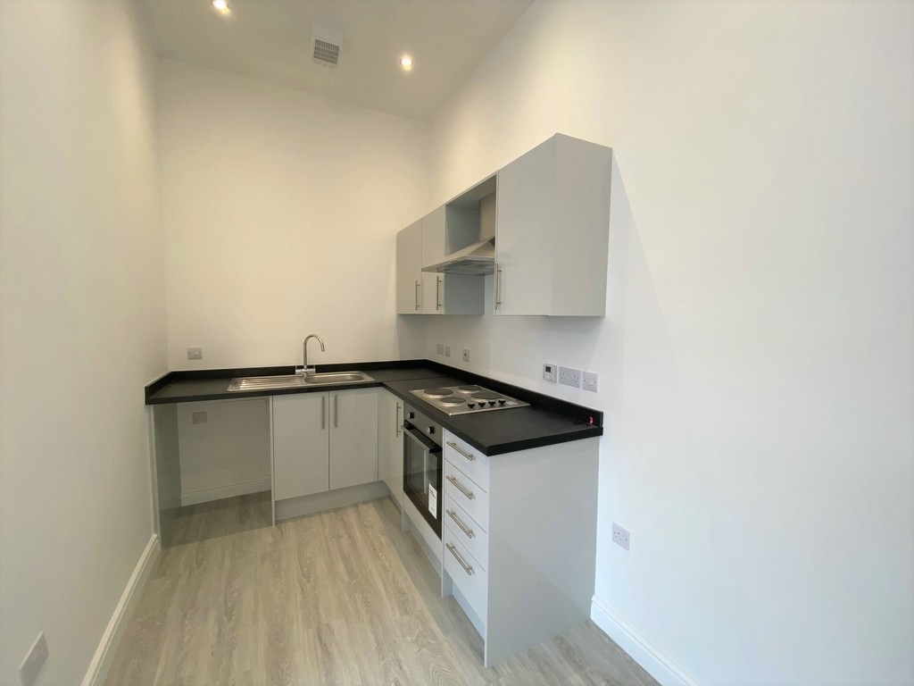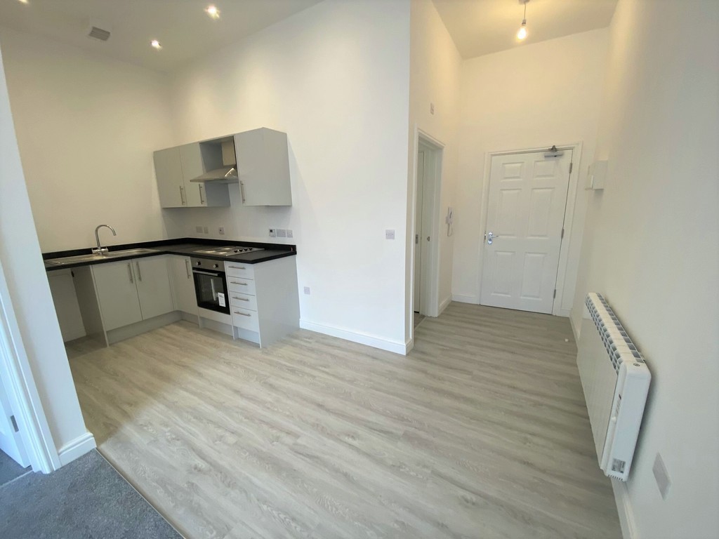 OPEN PLAN LIVING SPACE 25' 5" x 15' 11" (7.75m x 4.86m) Maximum measurements L-shaped. Kitchen area: Stainless steel single drainer sink unit with mixer tap over. Range of base units and drawers below, preparation surface. Matching wall units. Integrated electric oven and four ring hob with extractor canopy over. Space and facilities for washing machine, space for tall standing fridge/freezer. Ceiling spotlights. Ceiling light tunnel. Extractor fan. Laminate flooring. Dining area: Wall mounted electric consumer unit. Wall mounted electric heater. Ceiling light tunnel. Laminate flooring. Telecom entry system. Door to bathroom. Lounge area: Double glazed window to front with safety rail.