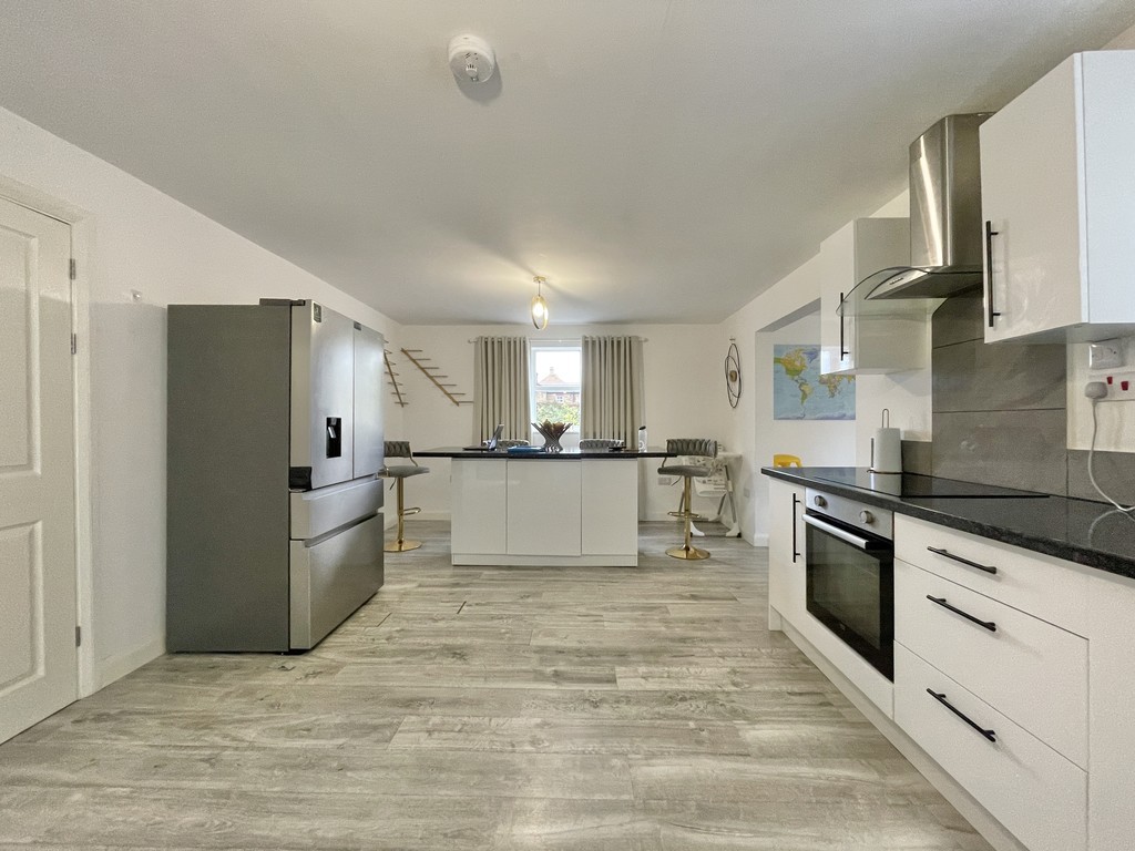 KITCHEN/BREAKFAST ROOM 21' 1" x 12' 4" (6.43m x 3.76m) Double glazed windows to both sides and rear, fitted kitchen including a range of matching wall and base units with worktop surfaces and tiled splashbacks, single drainer stainless steel sink unit, fitted electric oven, electric hob and canopy style extractor, space for dishwasher.