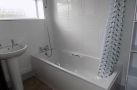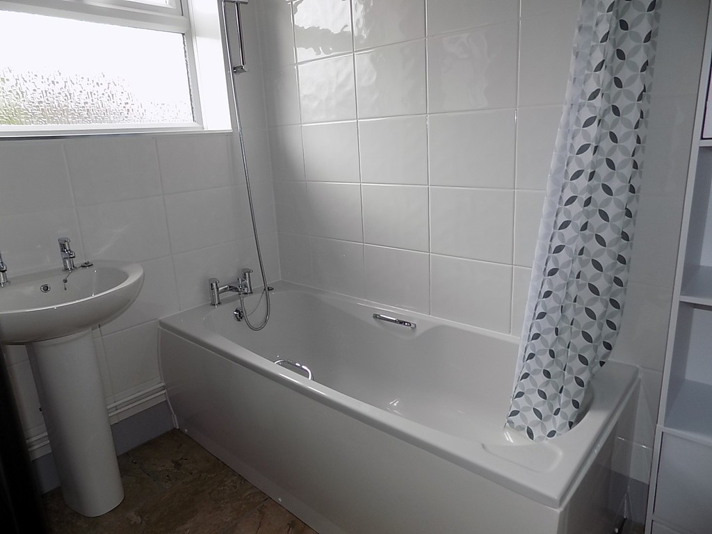 GF BATHROOM 7' 1" x 4' 10" (2.16m x 1.47m) Double glazed frosted window to rear, bath with shower attachment over, half tiled walls, pedestal wash basin, towel radiator, flat ceiling with light.